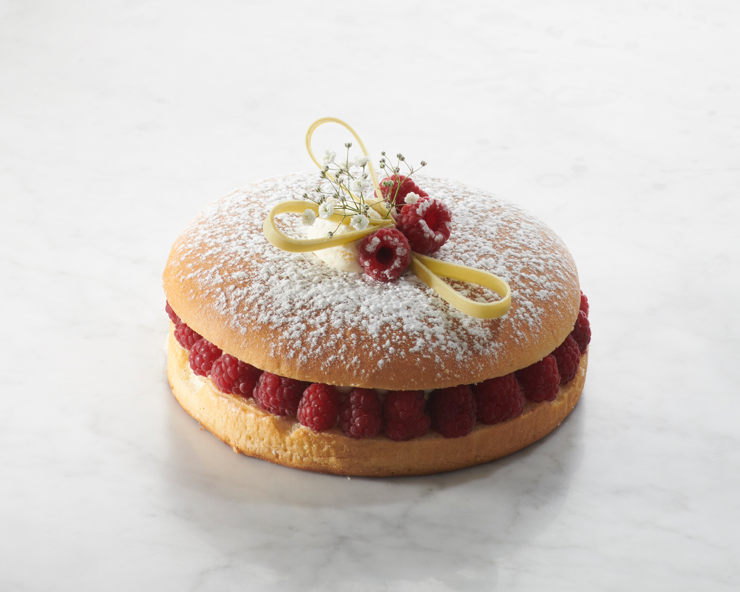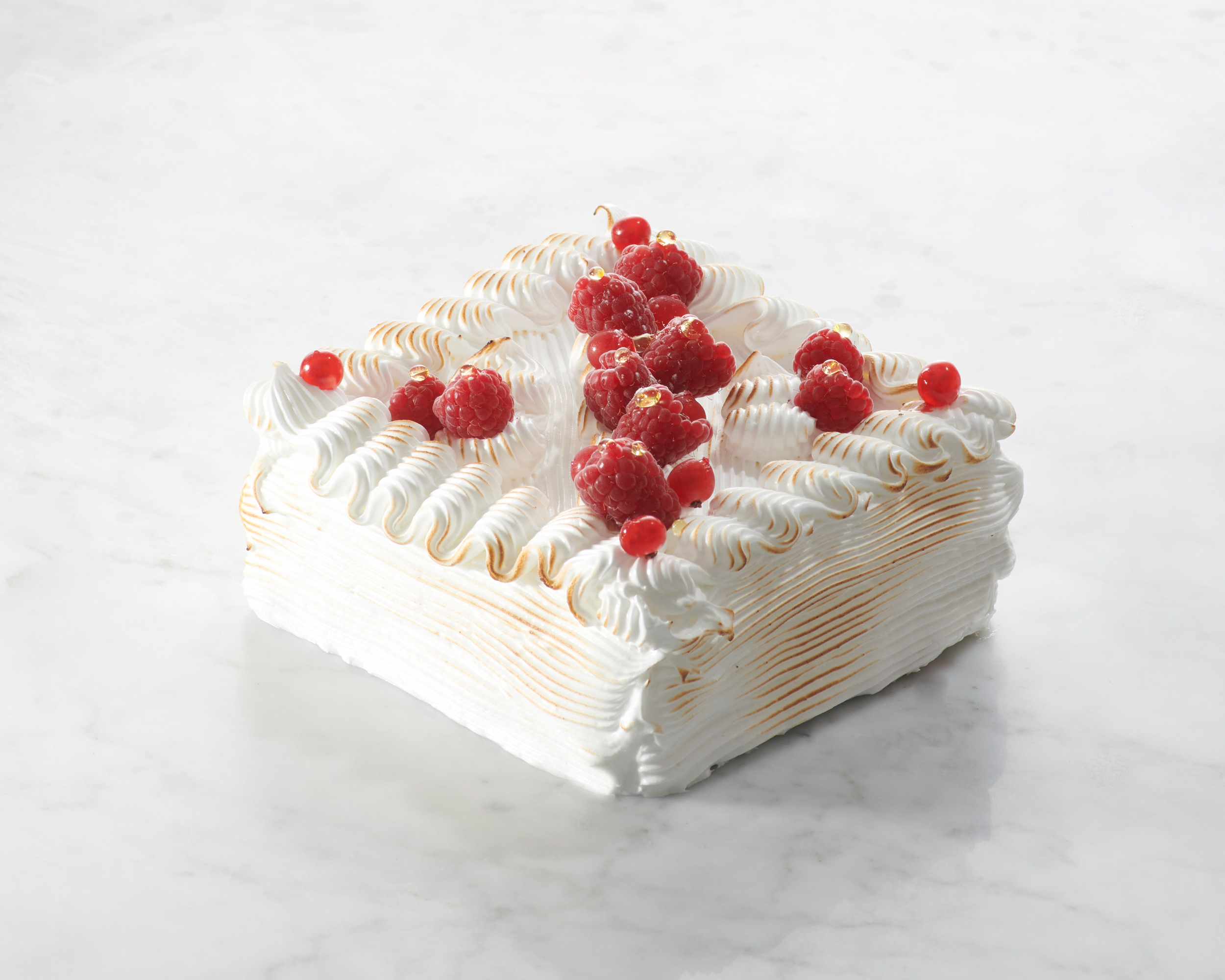 Génoise moelleuse, crème légère aux gousses de vanille, framboises fraiches, meringue à l’italienne.
