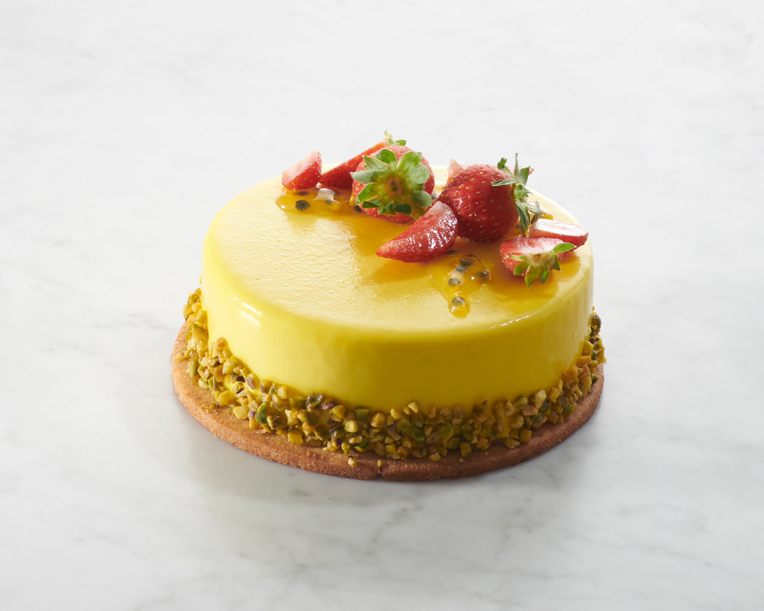 Crème mascarpone au fruit de la passion, crémeux fraise, biscuit à la pistache.